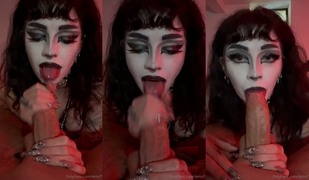 Lems7, with her gothic stare and pouty lips, drops to her knees to suck a massive, juicy cock. Her spit drips, her throat opens wide, and her eyes never break contact. Wet, raw, and deeply submissive—this blowjob is hypnotic and filthy.